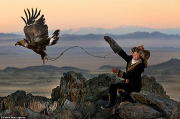 コンテストに参加するカザフ族は色艶やかな衣装に身をまとい、日ごろ調教している自慢の鷲を披露します。馬に颯爽とまたがり腕にはパートナーである鷲をのせコンテストは行われます。 人馬一体となり、鷲との連携をはかり狩りをする姿は圧巻です。