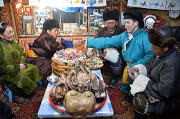 旧暦に従って決められるので日取りは毎年変わります。お正月には家族、親戚などが集まりごちそうを囲みながら、厳しい冬を乗り越えて春を迎える事に喜び、一年間の幸せを祈ります。「ツァガンサル(白い月)」の白はモンゴルでは純粋さを表現し、モンゴル人が尊ぶ乳の色でもあります。お正月は何も悪いことがない真っ白な月という意味もあります。元旦には日の出前に起き、きれいな服に着替え、それぞれの幸運の方向に歩き、功徳の方向から戻ります。この儀式の後、大地にミルクを捧げ、日の出とともに家族と挨拶を交わします。大晦日と旧正月をモンゴル式で遊牧民の家族といっしょに、お祝いしましょう。